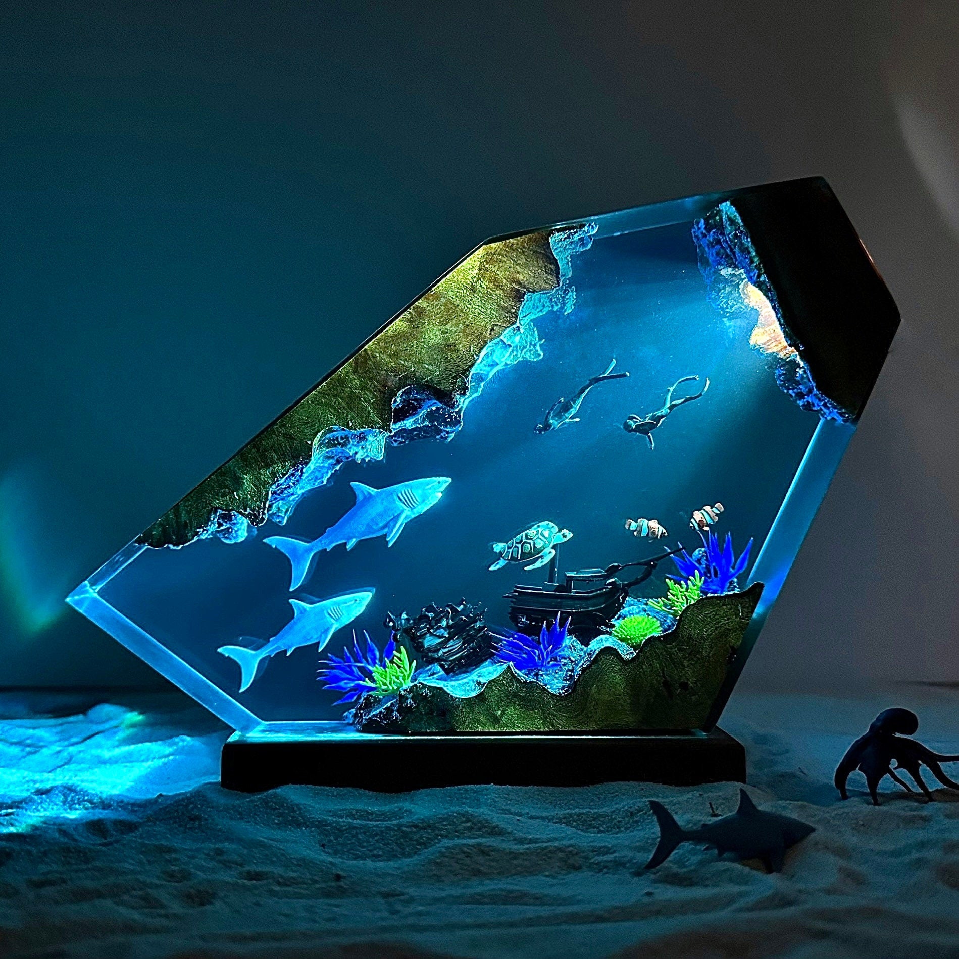 When the lamp is illuminated, the surrounding space gradually quiets down. The soft LED light spreads gently, evoking the sensation of sunlight filtering through deep ocean layers, guiding viewers into a peaceful world rich in emotional depth. This is not merely a lamp, but a meaningful collectible where handcrafted art and ocean inspiration harmoniously converge.
